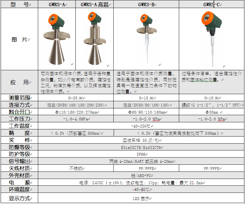 GWRS型雷達物位計因其特殊的非接觸式測量特性,可對有污染性和腐蝕性的介質(zhì)進行準確的測量,其穩(wěn)定和準確的表現(xiàn)也同樣體現(xiàn)在復(fù)雜的測量環(huán)境下。輸出的4~20mA信號可以提供遠端控制,采用了獨特的微波技術(shù)和Echo-tech回波處理技術(shù)以適應(yīng)各種工況。脈沖的工作方式可測小介電常數(shù)介質(zhì),并安全適用于各種金屬,非金屬容器內(nèi),對人體及環(huán)境無傷害。